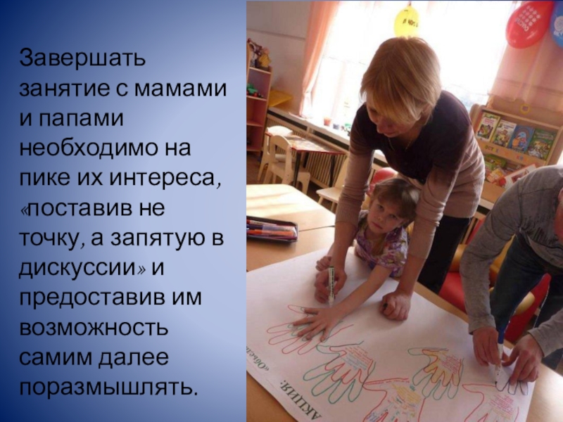 Слайд 12Завершать занятие с мамами и папами необходимо на пике их интереса,