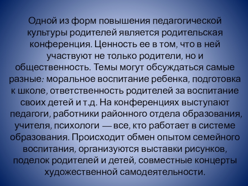 ее в том, что в ней участвуют не только родители, но и общественность. Темы могут обсуждаться самые разные: моральное воспитание ребенка, подготовка к школе, ответственность родителей за воспитание своих детей и т.д. На конференциях выступают педагоги, работники районного отдела образования, учителя, психологи — все, кто работает в системе образования. Происходит обмен опытом семейного воспитания, организуются выставки рисунков, поделок родителей и детей, совместные концерты художественной самодеятельности.