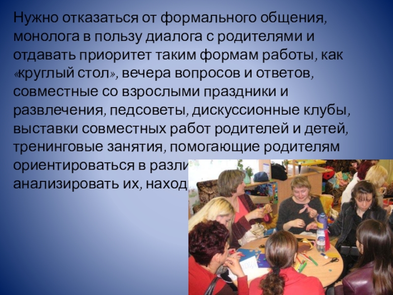 и отдавать приоритет таким формам работы, как «круглый стол», вечера вопросов и ответов, совместные со взрослыми праздники и развлечения, педсоветы, дискуссионные клубы, выставки совместных работ родителей и детей, тренинговые занятия, помогающие родителям ориентироваться в различных ситуациях, анализировать их, находить оптимальные решения.