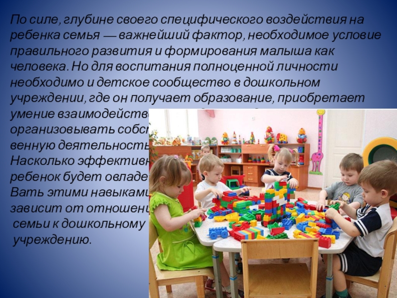 фактор, необходимое условие правильного развития и формирования малыша как человека. Но для воспитания полноценной личности необходимо и детское сообщество в дошкольном учреждении, где он получает образование, приобретает умение взаимодействовать с другими детьми и взрослыми,