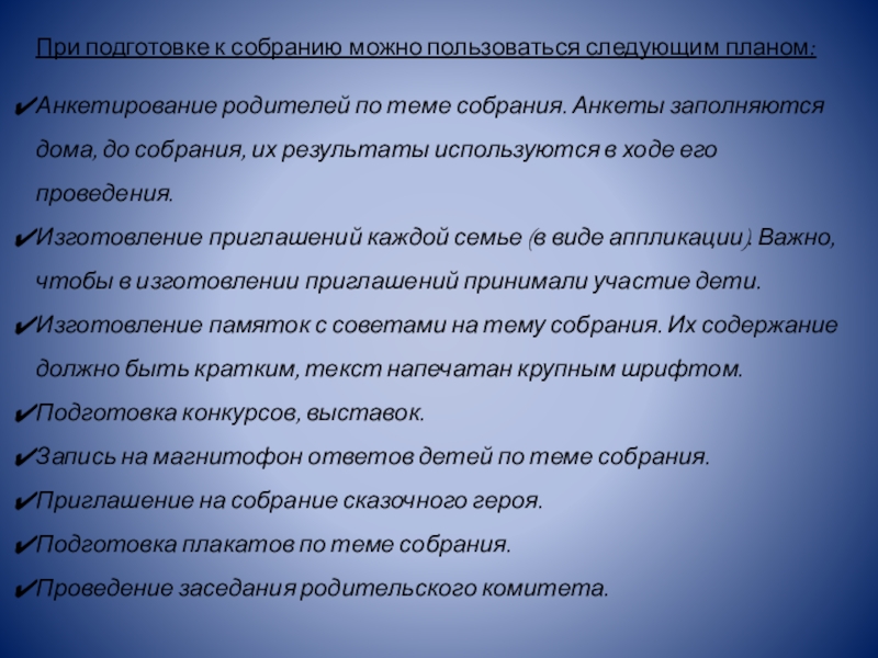 Слайд 25При подготовке к собранию можно пользоваться следующим планом: