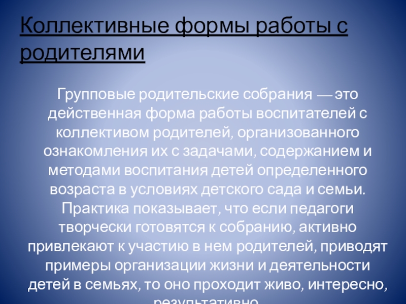 работы воспитателей с коллективом родителей, организованного ознакомления их с задачами, содержанием и методами воспитания детей определенного возраста в условиях детского сада и семьи. Практика показывает, что если педагоги творчески готовятся к собранию, активно привлекают к участию в нем родителей, приводят примеры организации жизни и деятельности детей в семьях, то оно проходит живо, интересно, результативно.