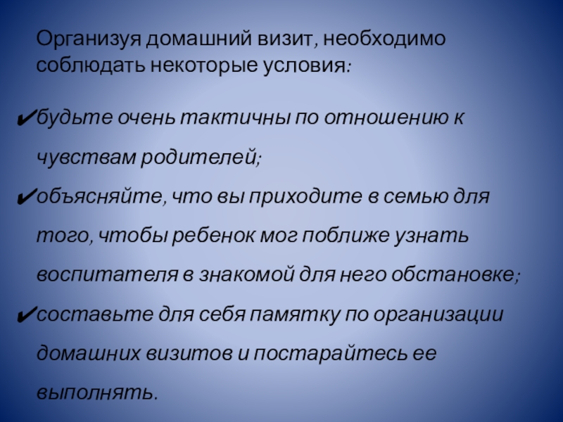 Слайд 19Организуя домашний визит, необходимо соблюдать некоторые условия: