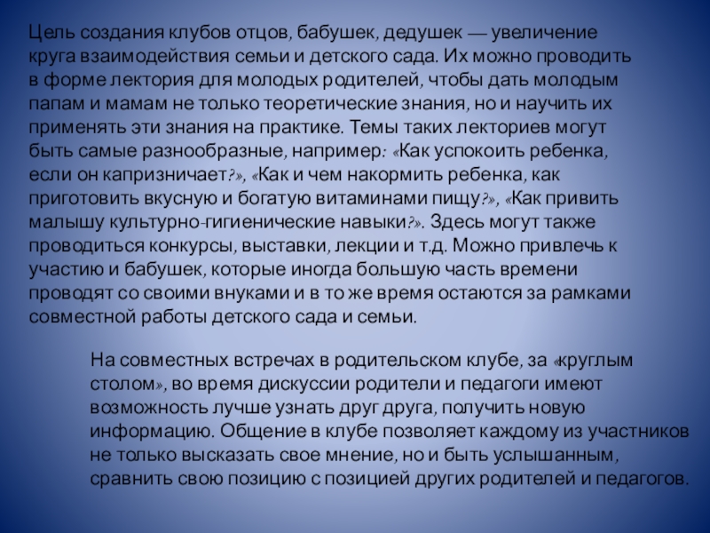 Слайд 30Цель создания клубов отцов, бабушек, дедушек — увеличение круга взаимодействия семьи