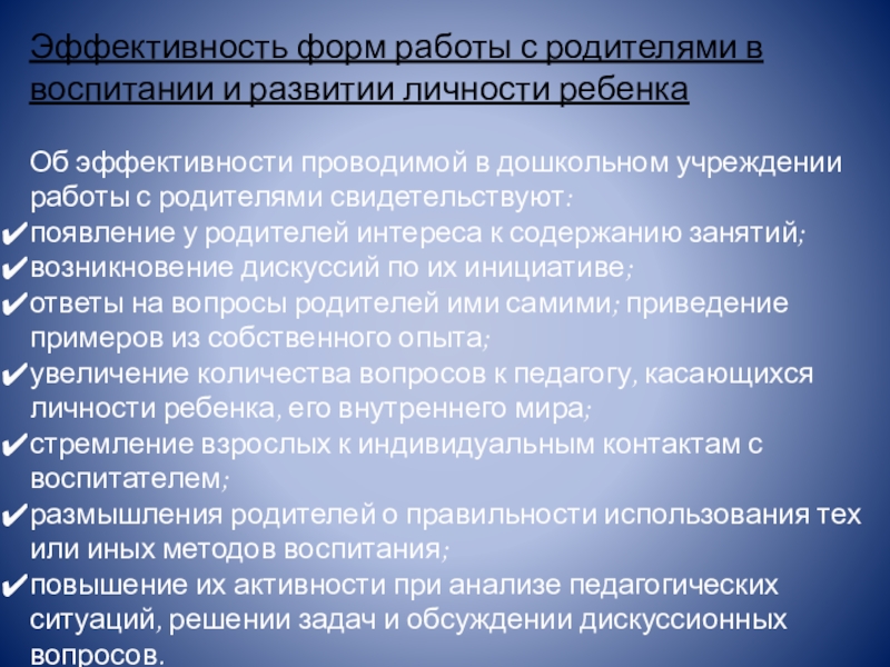Слайд 35Эффективность форм работы с родителями в воспитании и развитии личности ребенка
