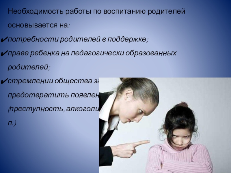 Слайд 3Необходимость работы по воспитанию родителей основывается на: