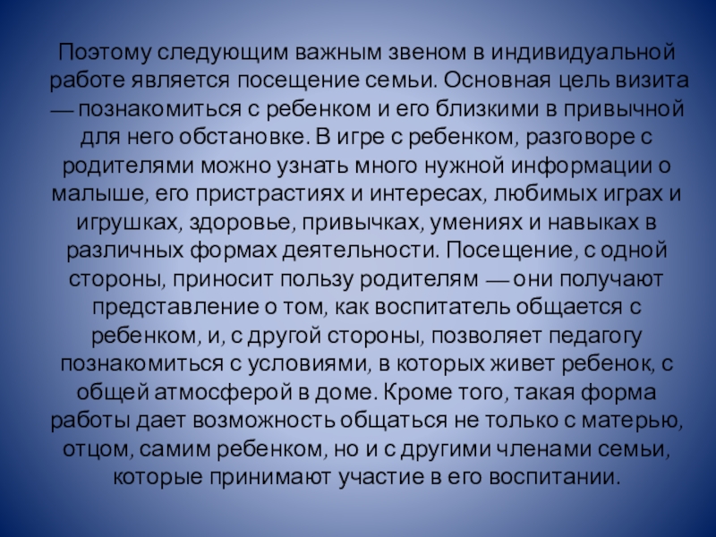 Слайд 18Поэтому следующим важным звеном в индивидуальной работе является посещение семьи. Основная