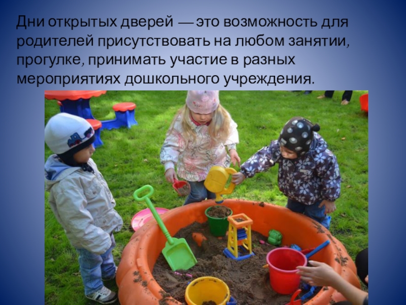 Слайд 29Дни открытых дверей — это возможность для родителей присутствовать на любом