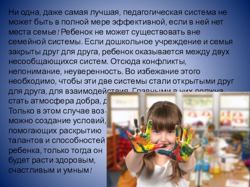 полной мере эффективной, если в ней нет места семье! Ребенок не может существовать вне семейной системы. Если дошкольное учреждение и семья закрыты друг для друга, ребенок оказывается между двух несообщающихся систем. Отсюда конфликты, непонимание, неуверенность. Во избежание этого необходимо, чтобы эти две системы стали открытыми друг для друга, для взаимодействия. Главными в них должна стать атмосфера добра, доверия и взаимопонимания.