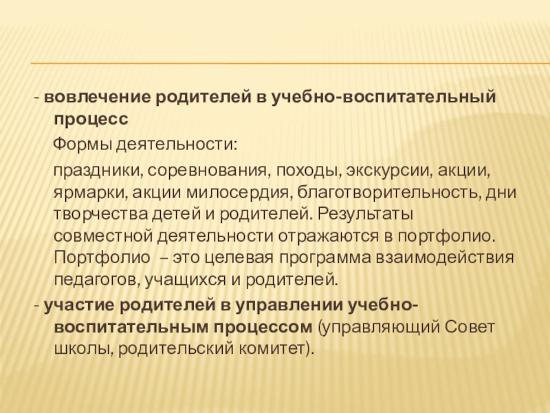 праздники, соревнования, походы, экскурсии, акции, ярмарки, акции милосердия, благотворительность, дни творчества детей и родителей. Результаты совместной деятельности отражаются в портфолио. Портфолио – это целевая программа взаимодействия педагогов, учащихся и родителей.