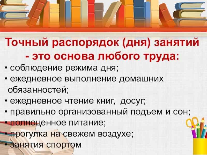 Слайд 6Точный распорядок (дня) занятий - это основа любого труда: