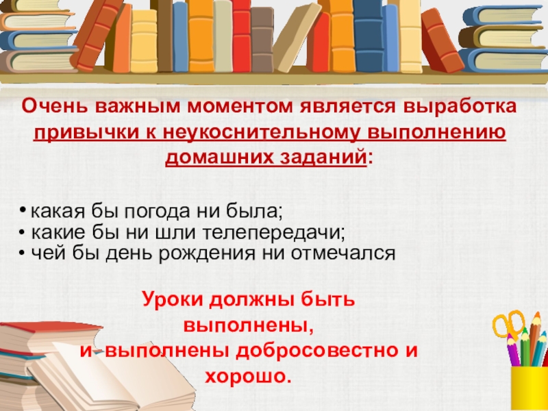 Слайд 9Очень важным моментом является выработка привычки к неукоснительному выполнению домашних заданий: