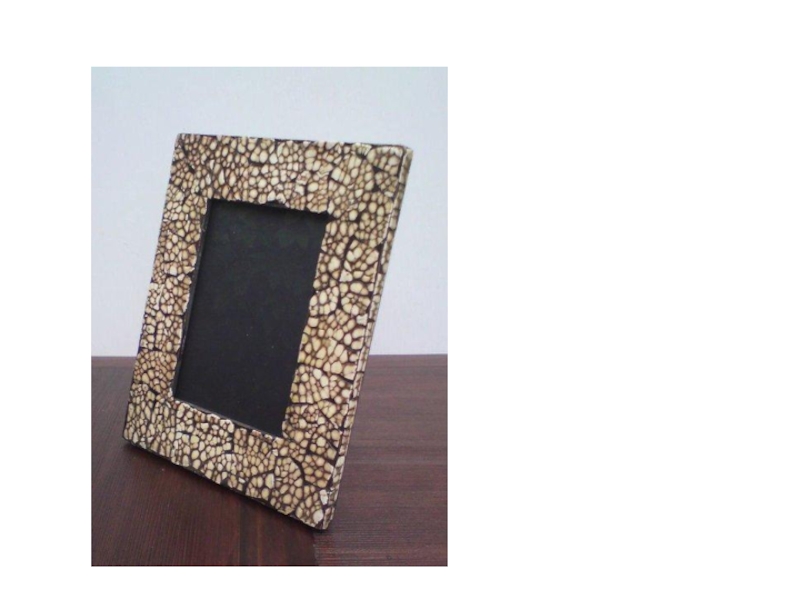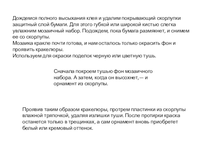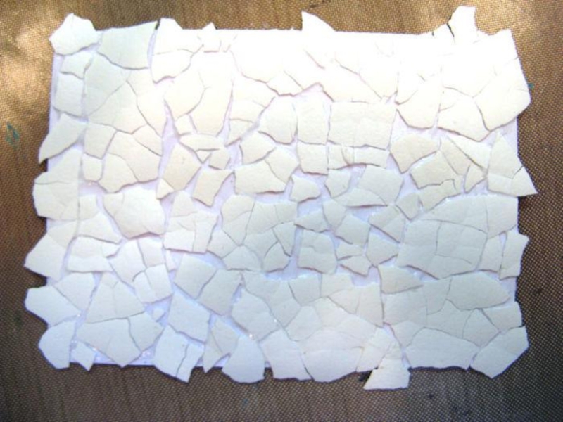 Проявив таким образом кракелюры, протрем пластинки из скорлупы влажной тряпочкой, удаляя излишки туши. После протирки краска останется только в трещинках, а сам орнамент вновь приобретет белый или кремовый оттенок.