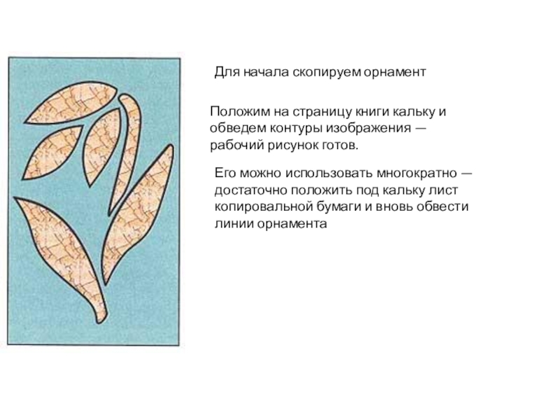 Его можно использовать многократно — достаточно положить под кальку лист копировальной бумаги и вновь обвести линии орнамента