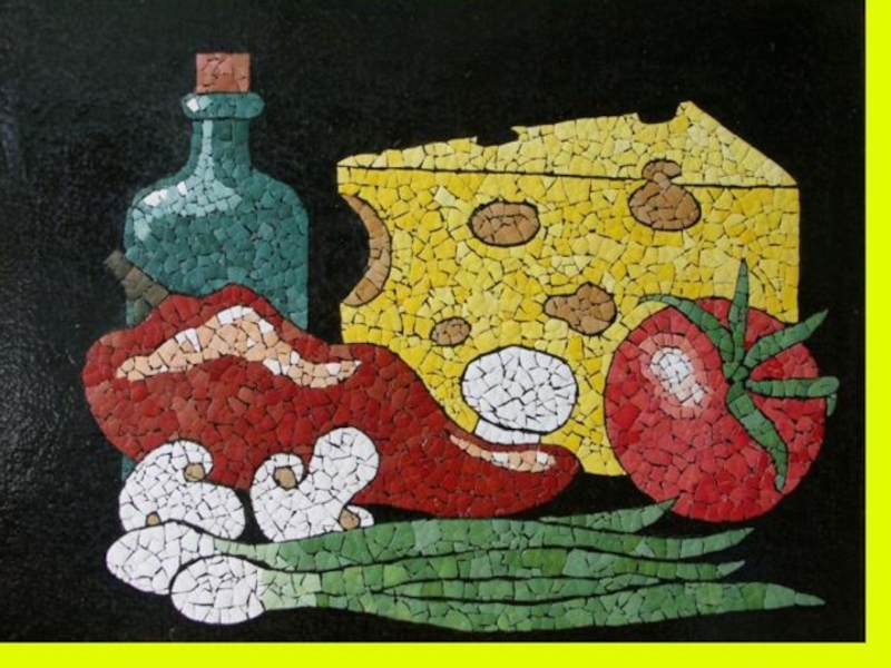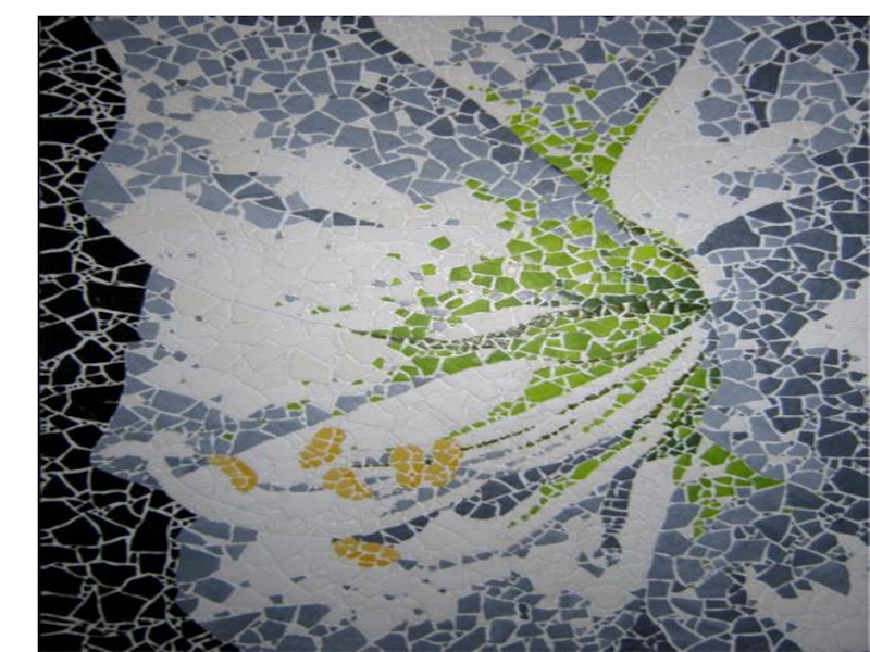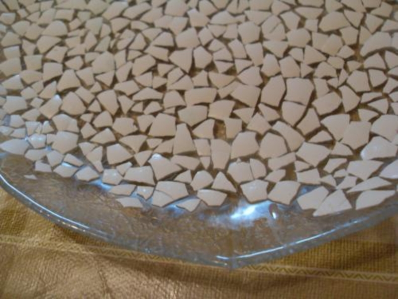 Вырезав из яичной скорлупы все части мозаики, смажем их изнанку клеем ПВА и приклеим к фону.