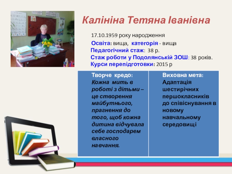 Класовод 1 класу: Калініна Тетяна Іванівна ( вища категорія)
