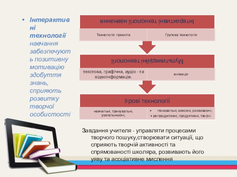 Завдання учителя - управляти процесами творчого пошуку,створювати ситуації, що сприяють творчій активності та спрямованості школяра, розвивають його уяву та асоціативне мислення