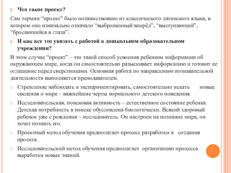 В этом случае “проект” – это такой способ усвоения ребенком информации об окружающем мире, когда он самостоятельно разыскивает информацию и готовит ее оглашение перед сверстниками. Основная работа по направлению познавательной деятельности выполняется преподавателем.