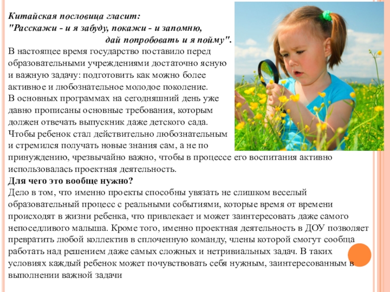 принуждению, чрезвычайно важно, чтобы в процессе его воспитания активно использовалась проектная деятельность.