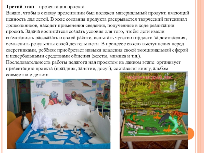 Последовательность работы педагога над проектом на данном этапе: организует презентацию проекта (праздник, занятие, досуг), составляет книгу, альбом совместно с детьми.