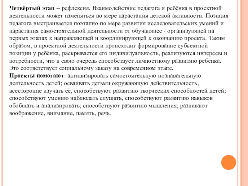 Слайд 14Четвёртый этап – рефлексия. Взаимодействие педагога и ребёнка в проектной деятельности может