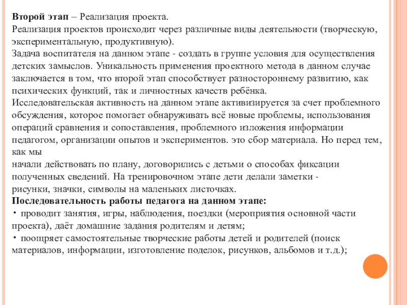Задача воспитателя на данном этапе - создать в группе условия для осуществления детских замыслов. Уникальность применения проектного метода в данном случае заключается в том, что второй этап способствует разностороннему развитию, как психических функций, так и личностных качеств ребёнка.