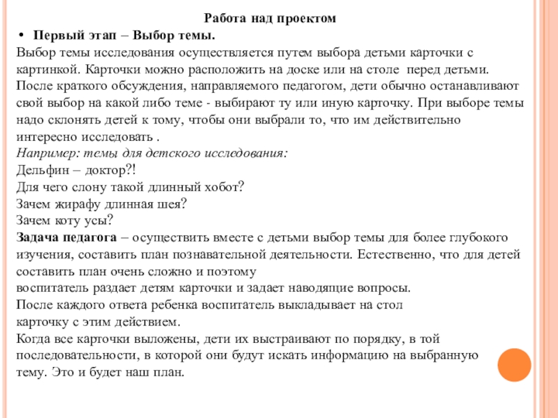 выбора детьми карточки с картинкой. Карточки можно расположить на доске или на столе перед детьми. После краткого обсуждения, направляемого педагогом, дети обычно останавливают свой выбор на какой либо теме - выбирают ту или иную карточку. При выборе темы надо склонять детей к тому, чтобы они выбрали то, что им действительно интересно исследовать .