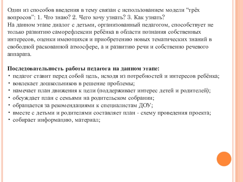 Задача педагога – осуществить вместе с детьми выбор темы для более глубокого изучения, составить план познавательной деятельности. Естественно, что для детей составить план очень сложно и поэтому