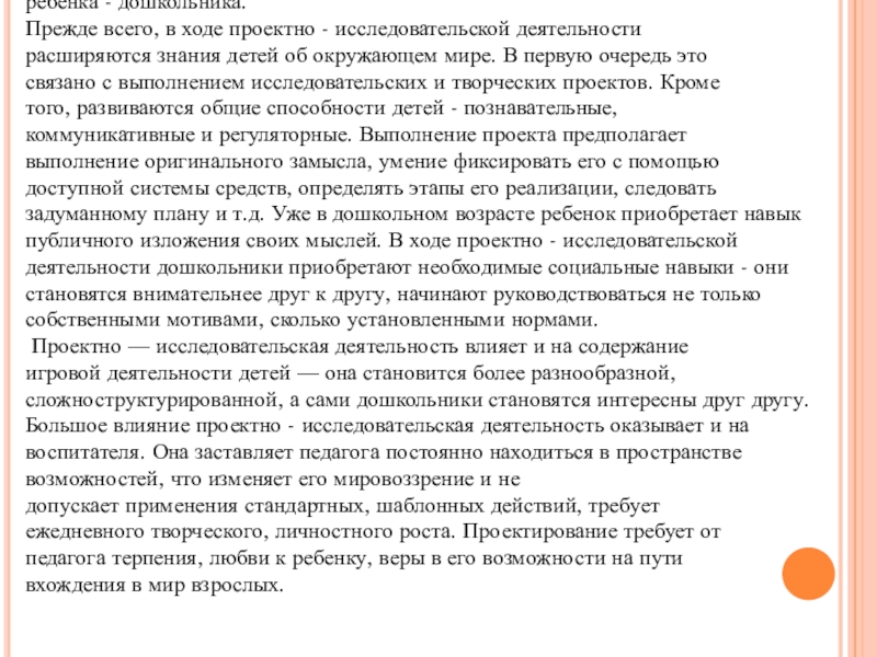 Большое влияние проектно - исследовательская деятельность оказывает и на воспитателя. Она заставляет педагога постоянно находиться в пространстве возможностей, что изменяет его мировоззрение и не