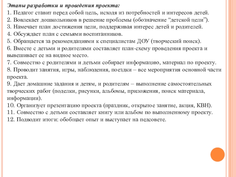 • вместе с детьми и родителями составляет план - схему проведения проекта;