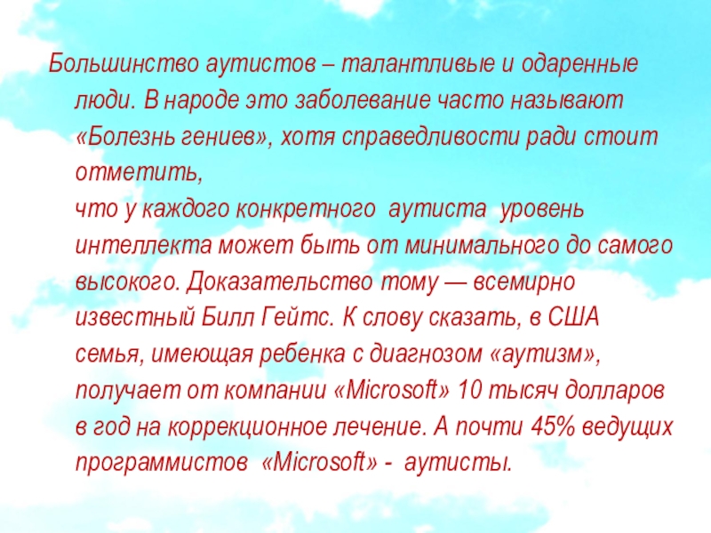 что у каждого конкретного аутиста уровень интеллекта может быть от минимального до самого высокого. Доказательство тому — всемирно известный Билл Гейтс. К слову сказать, в США семья, имеющая ребенка с диагнозом «аутизм», получает от компании «Microsoft» 10 тысяч долларов в год на коррекционное лечение. А почти 45% ведущих программистов «Microsoft» - аутисты.