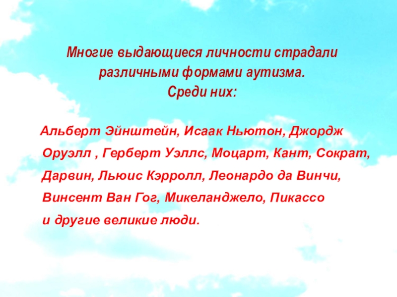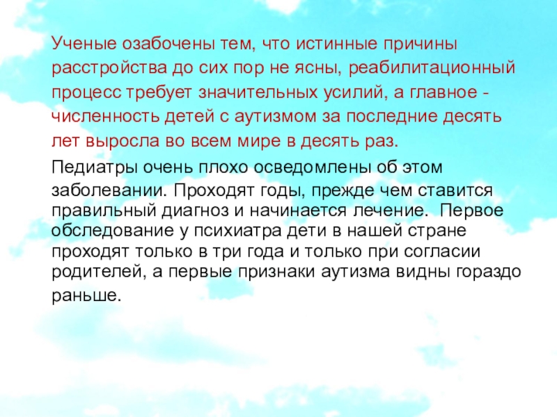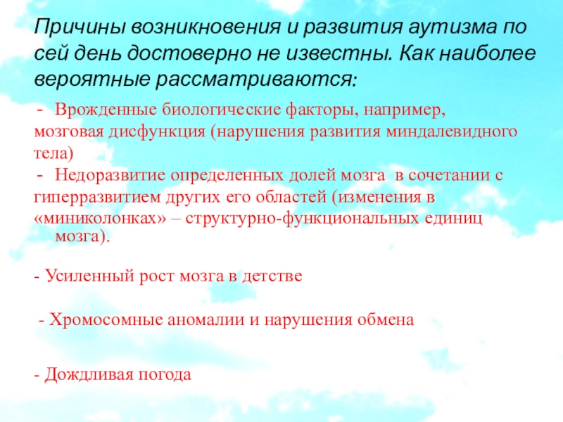 Слайд 8Причины возникновения и развития аутизма по сей день достоверно не известны.