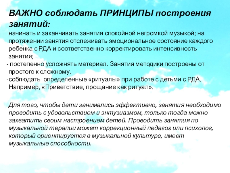 музыкой; на протяжении занятия отслеживать эмоциональное состояние каждого ребенка с РДА и соответственно корректировать интенсивность занятия;
