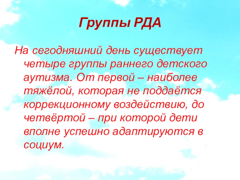 Слайд 12На сегодняшний день существует четыре группы раннего детского аутизма. От первой