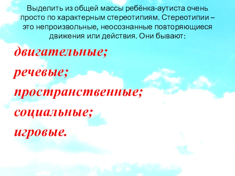 Слайд 10Выделить из общей массы ребёнка-аутиста очень просто по характерным стереотипиям. Стереотипии