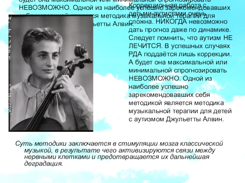 детьми-аутистами очень сложна. НИКОГДА невозможно дать прогноз даже по динамике. Следует помнить, что аутизм НЕ ЛЕЧИТСЯ. В успешных случаях РДА поддаётся лишь коррекции. А будет она максимальной или минимальной спрогнозировать НЕВОЗМОЖНО. Одной из наиболее успешно зарекомендовавших себя методикой является методика музыкальной терапии для детей с аутизмом Джульетты Алвин.