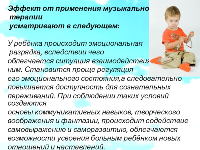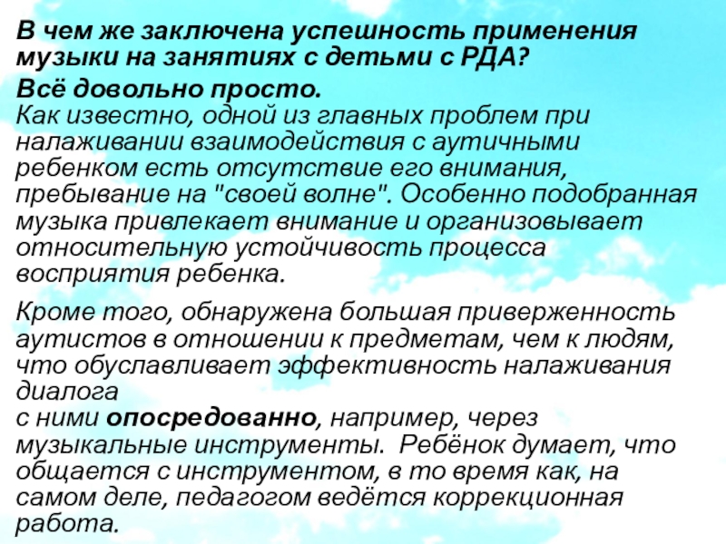 с ними опосредованно, например, через музыкальные инструменты. Ребёнок думает, что общается с инструментом, в то время как, на самом деле, педагогом ведётся коррекционная работа.