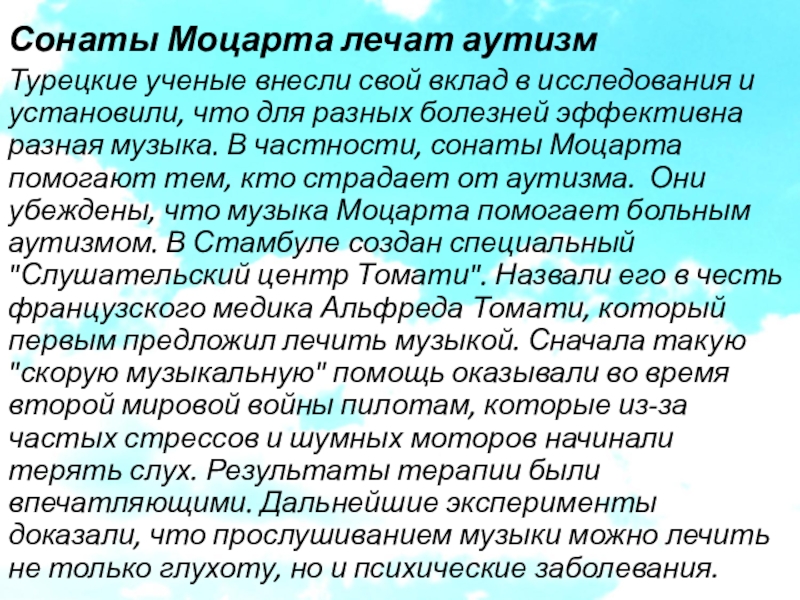 установили, что для разных болезней эффективна разная музыка. В частности, сонаты Моцарта помогают тем, кто страдает от аутизма. Они убеждены, что музыка Моцарта помогает больным аутизмом. В Стамбуле создан специальный "Слушательский центр Томати". Назвали его в честь французского медика Альфреда Томати, который первым предложил лечить музыкой. Сначала такую "скорую музыкальную" помощь оказывали во время второй мировой войны пилотам, которые из-за частых стрессов и шумных моторов начинали терять слух. Результаты терапии были впечатляющими. Дальнейшие эксперименты доказали, что прослушиванием музыки можно лечить не только глухоту, но и психические заболевания.