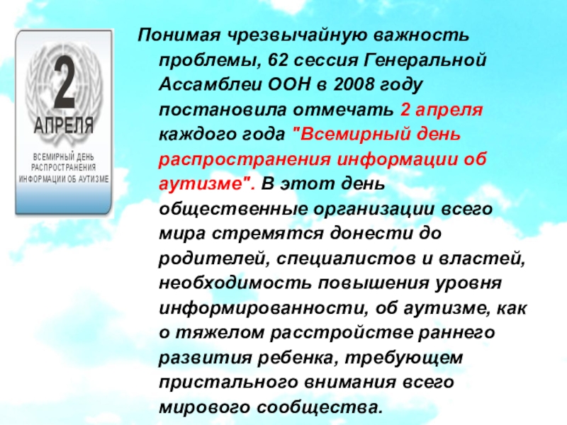 году постановила отмечать 2 апреля каждого года "Всемирный день распространения информации об аутизме". В этот день общественные организации всего мира стремятся донести до родителей, специалистов и властей, необходимость повышения уровня информированности, об аутизме, как о тяжелом расстройстве раннего развития ребенка, требующем пристального внимания всего мирового сообщества.