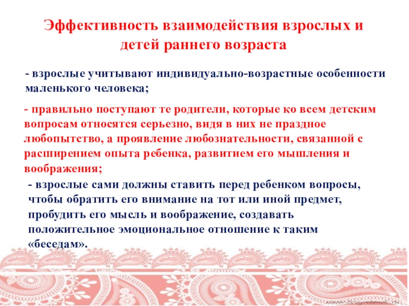 - взрослые сами должны ставить перед ребенком вопросы, чтобы обратить его внимание на тот или иной предмет, пробудить его мысль и воображение, создавать положительное эмоциональное отношение к таким «беседам».