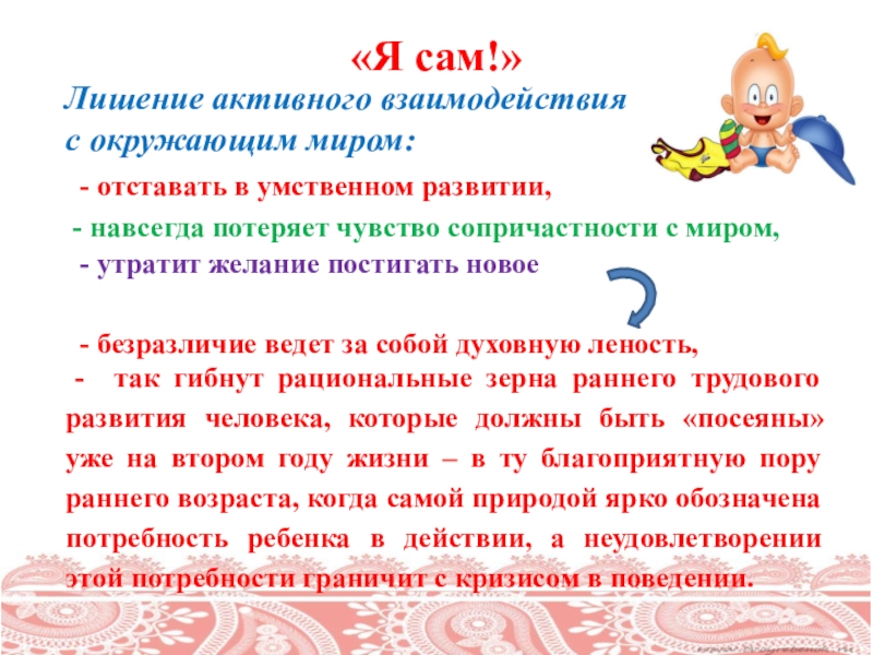 - так гибнут рациональные зерна раннего трудового развития человека, которые должны быть «посеяны» уже на втором году жизни – в ту благоприятную пору раннего возраста, когда самой природой ярко обозначена потребность ребенка в действии, а неудовлетворении этой потребности граничит с кризисом в поведении.