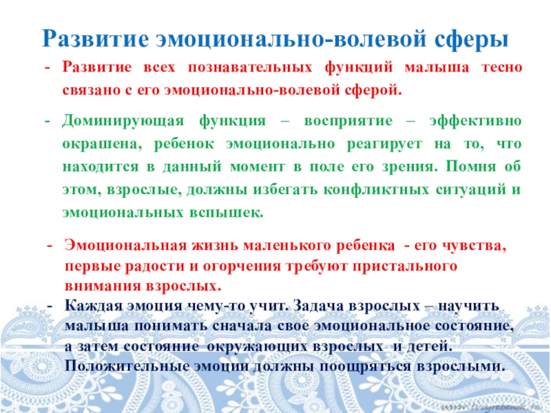 Каждая эмоция чему-то учит. Задача взрослых – научить малыша понимать сначала свое эмоциональное состояние, а затем состояние окружающих взрослых и детей. Положительные эмоции должны поощряться взрослыми.