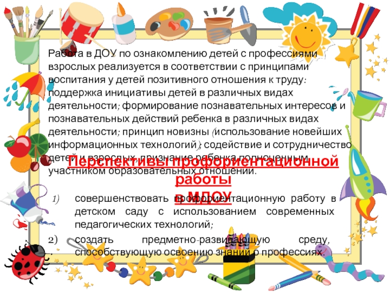 совершенствовать профориентационную работу в детском саду с использованием современных педагогических технологий;