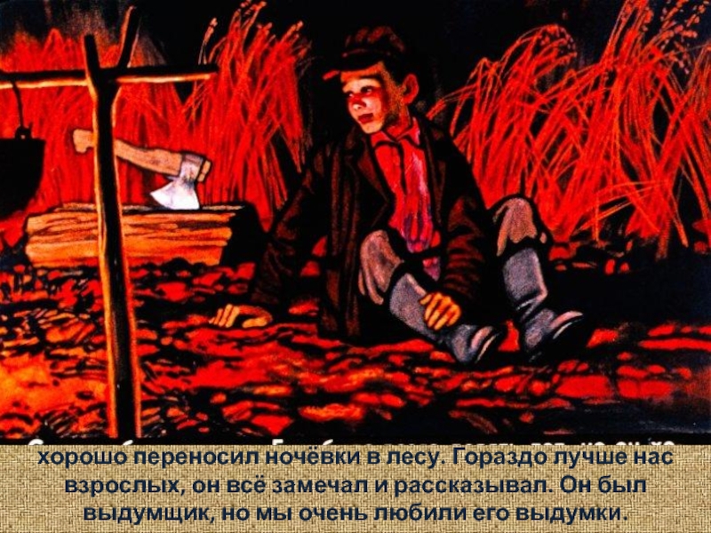 хорошо переносил ночёвки в лесу. Гораздо лучше нас взрослых, он всё замечал и рассказывал. Он был выдумщик, но мы очень любили его выдумки.