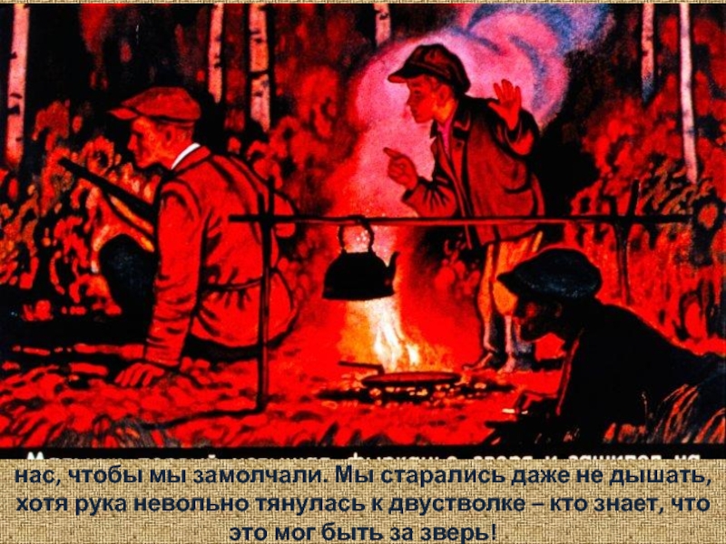 Слайд 14Мы были уверенны, что огонь пугает зверей, но однажды вечером в