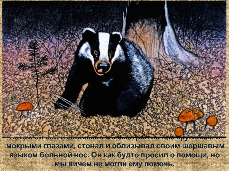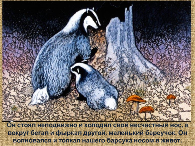 Слайд 46…вокруг бегал и фыркал другой, маленький барсучок. Он волновался и толкал
