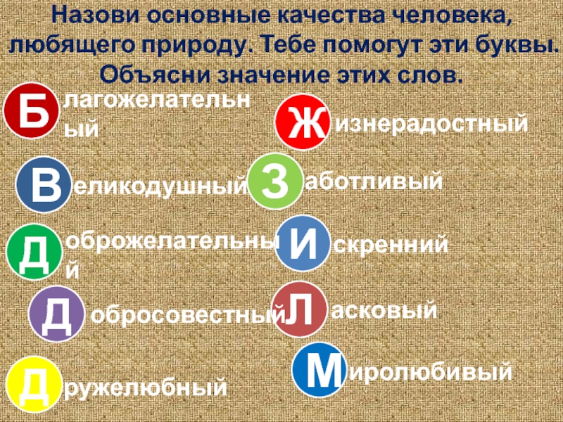 Слайд 48Назови основные качества человека, любящего природу. Тебе помогут эти буквы.