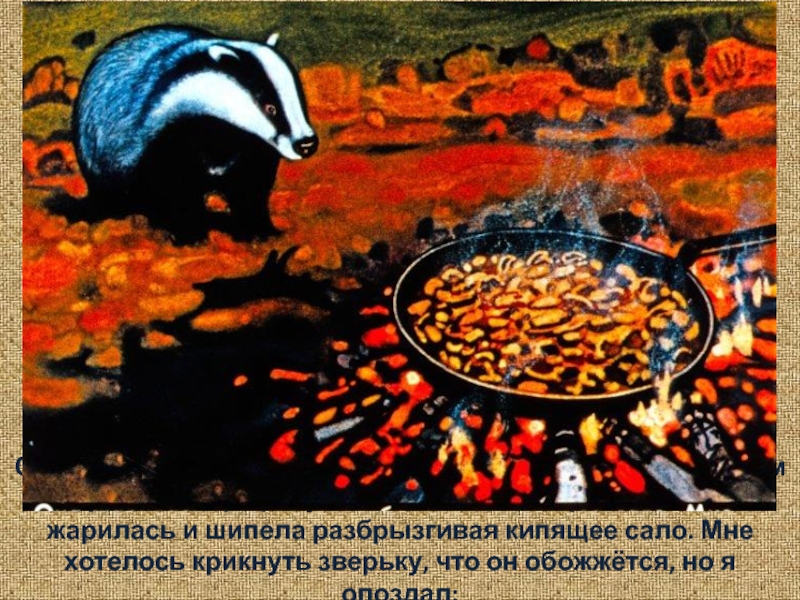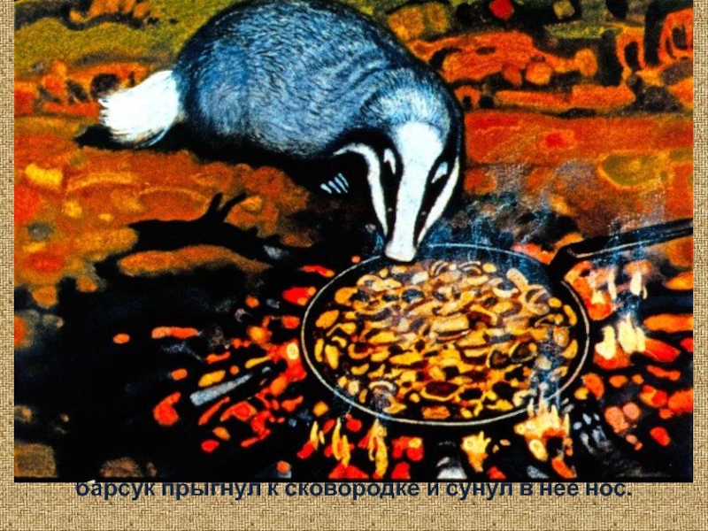 Слайд 27барсук прыгнул к сковородке и сунул в неё нос.