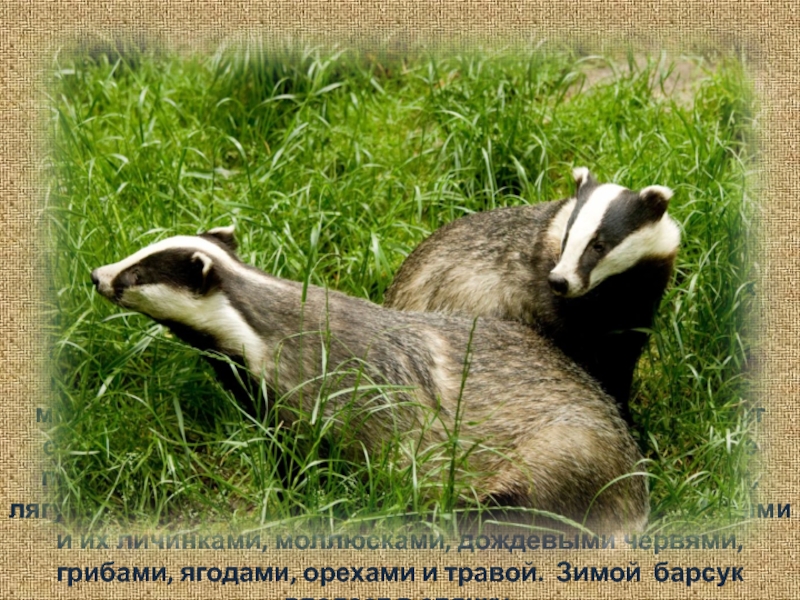 ночной образ жизни. Барсук не агрессивен по отношению к хищникам и человеку, он предпочитает отойти и укрыться в нору или в другое место, но если его разозлить, то он бьёт носом и кусает обидчика, а затем убегает. Барсук всеяден, но больше предпочитает растительную пищу. Питается мышами, лягушками, ящерицами, птицами и их яйцами, насекомыми и их личинками, моллюсками, дождевыми червями, грибами, ягодами, орехами и травой. Зимой барсук впадает в спячку.
