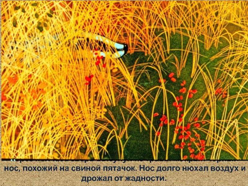 Слайд 22Потом из травы показалась острая мордочка с чёрными пронзительными глазами.